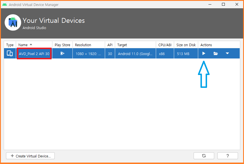 저는 AVD_Pixel 2 API 30으로 그냥 해봤어요.ㅋ