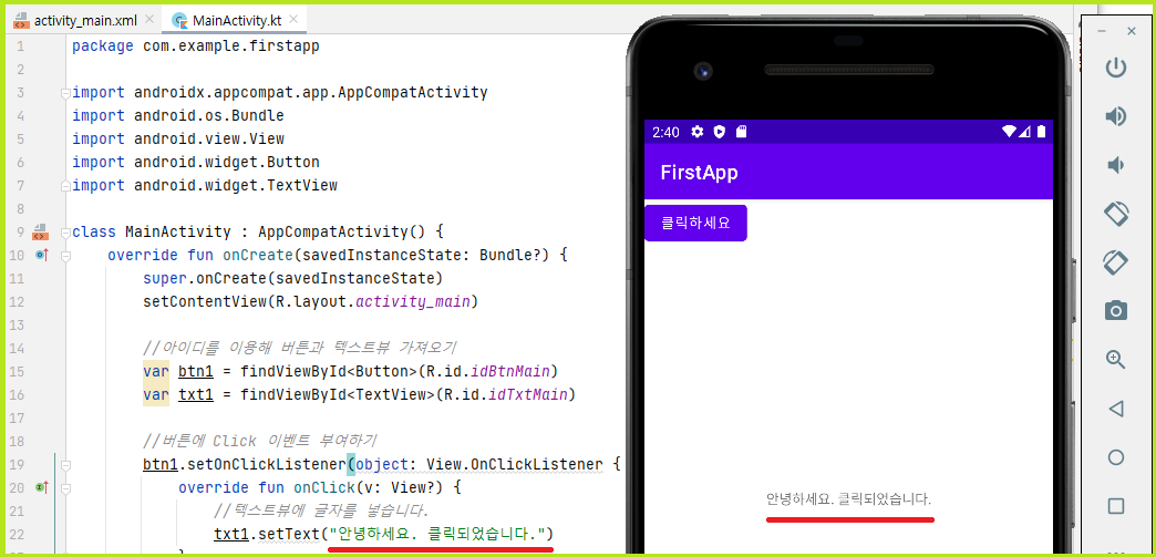 클릭 이벤트 수행 함수 onClick으로 텍스트뷰에 문자열을 지정했습니다.
