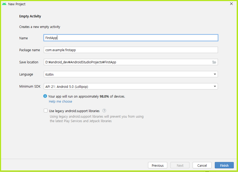 프로젝트명을 FirstApp으로 했습니다.