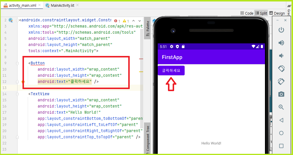 버튼만 하나 추가해서 텍스트뷰에 글자를 찍는 초간단 앱을 만들어볼게요.