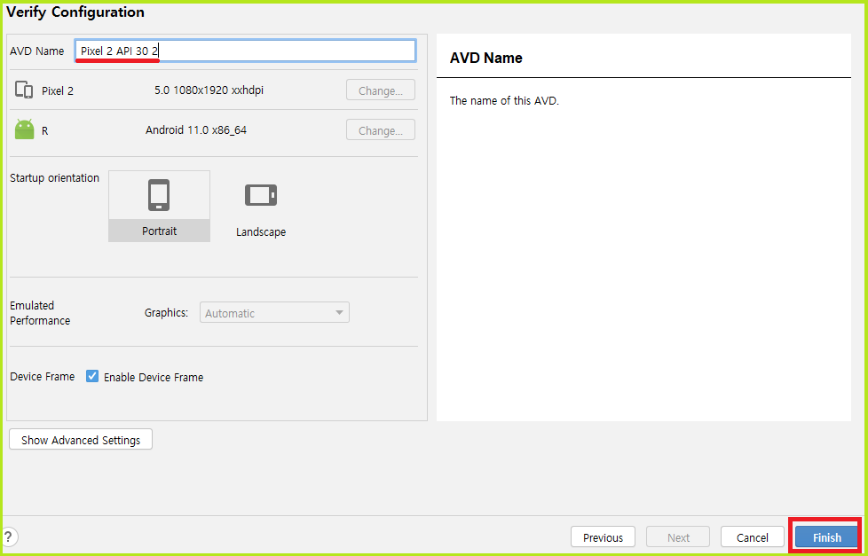 AVD 이름을 적당히 정해주세요.