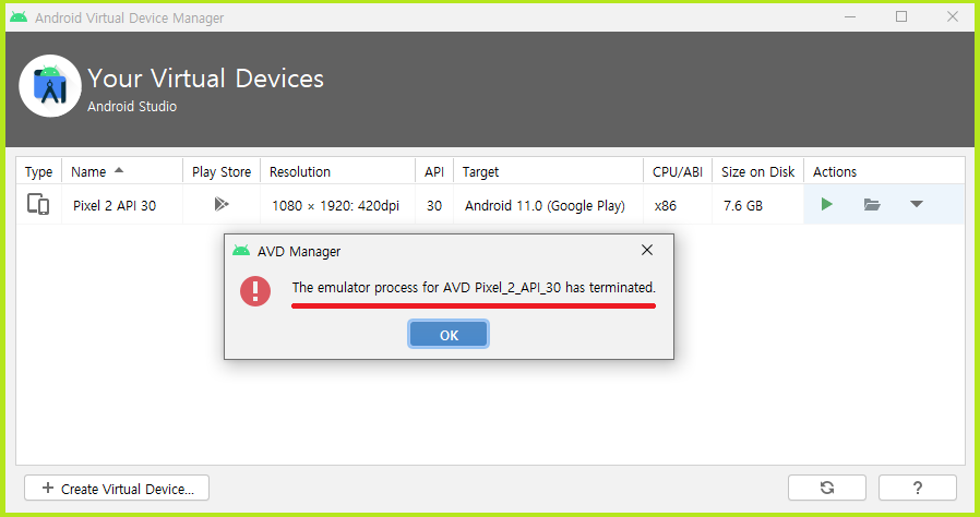 며칠 잘 사용하다가 갑자기 AVD가 실행이 안되는 현상이 발생했어요.