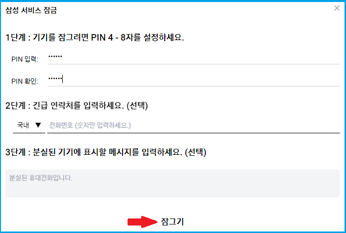 잠그기 클릭하시면 스마트폰이 잠겨 PIN번호가 맞지 않으면