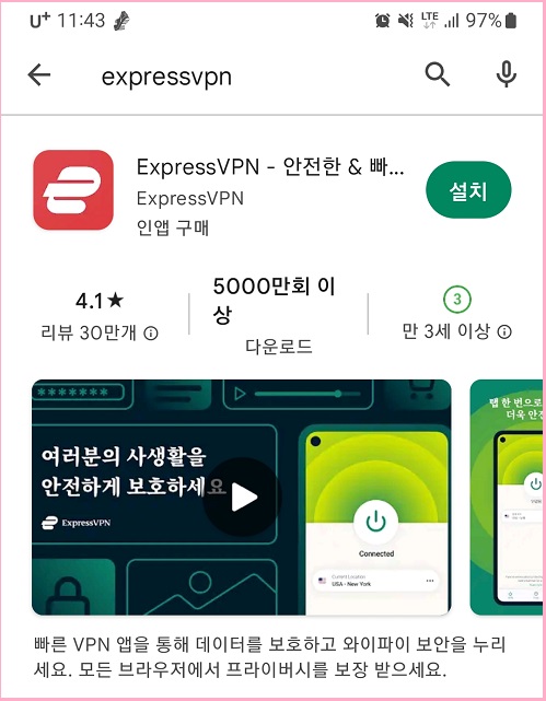 구글 Play스토어에서 ExpressVPN 검색해서 설치해 주세요.