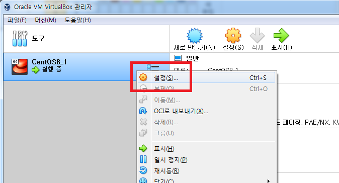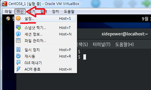1) CentOS8_1 가상머신 메뉴에서 머신 - 설정 메뉴를 클릭합니다.