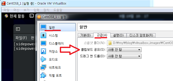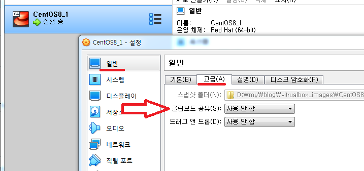 1) CentOS8_1 가상 머신이 설정 메뉴로 들어갑니다.