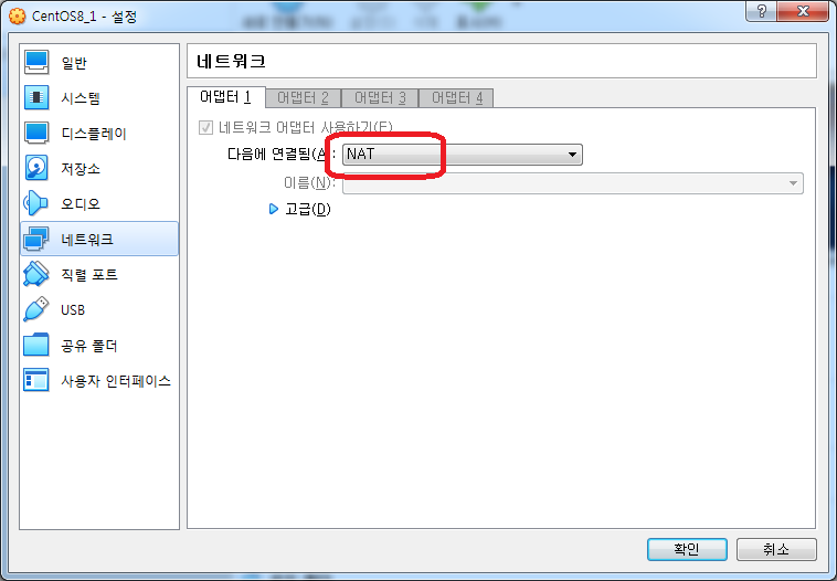 일단 인터넷 되게 NAT 로 지정해 주세요. ^^;;