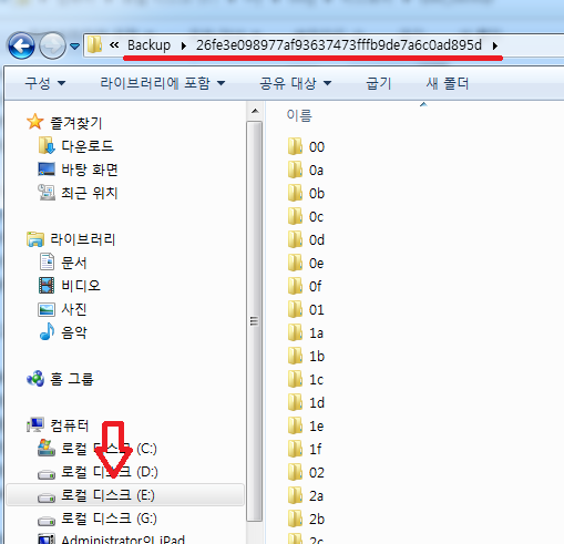 아이튠즈에서 Backup 폴더에 자료를 넣는 순간 E 드라이브의 Backup 폴더에