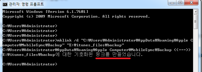 mklink /d "C:\Users\Administrator\AppData\Roaming\Apple Computer\MobileSync\Backup" "E:\itunes_files\backup"